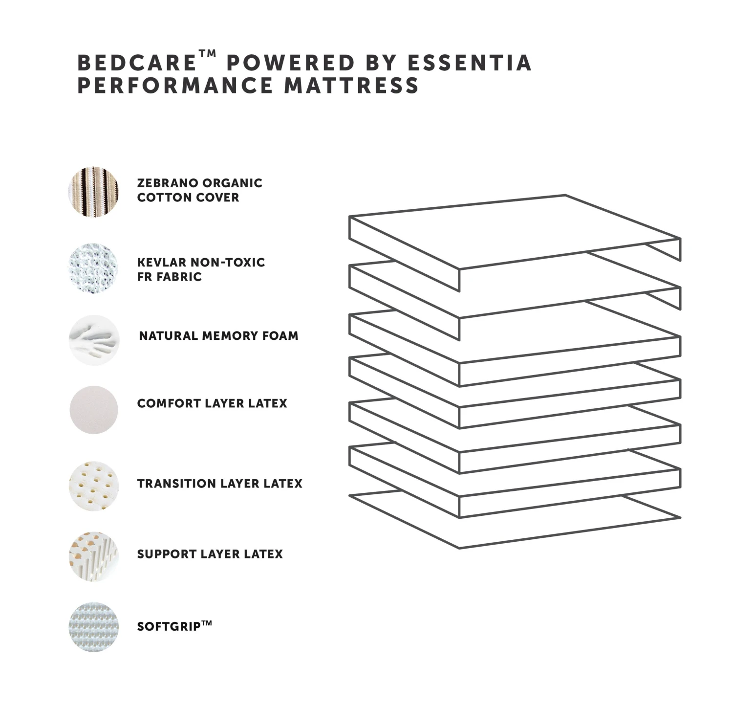 Breathe easy on our allergy friendly BedCare™ Performance Mattresses powered by Essentia technology! Our BedCare™ mattress offers health and sanitary benefits; dust-mite and bed bug deterrent, full pressure distribution, and superior body support. Featuring the patented natural memory foam you will experience the true physical support and contouring comfort. Organic mattresses, but better! You no longer need to compromise on comfort when committed to a healthy lifestyle. BedCare™ Mattresses powered by Essentia go above and beyond. BedCare™ Performance mattresses are far more comfortable than regular latex mattresses topped with wool. Made with 2 inches of our natural memory foam, expect pressure relief only a true memory foam mattress can provide. The gentle cradle on the hips and shoulders allows for proper support and blood circulation, and the added health benefits for allergy sufferers make for a perfect night’s sleep! Each mattress is 8 inches in height.