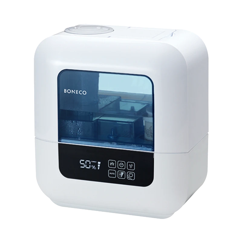 Included with the intuitive Boneco U700 warm mist humidifier are an internal humidity gauge or hygrostat and LCD Digital Display. This gives you an up-to-the-minute reading of what the relative humidity is in your home. The display is equipped with a dimmer function and a relaxing ambient LED night light. Additionally, soft-touch controls combined with a simple-to-use LCD digital display make setting your Boneco humidifier easy.