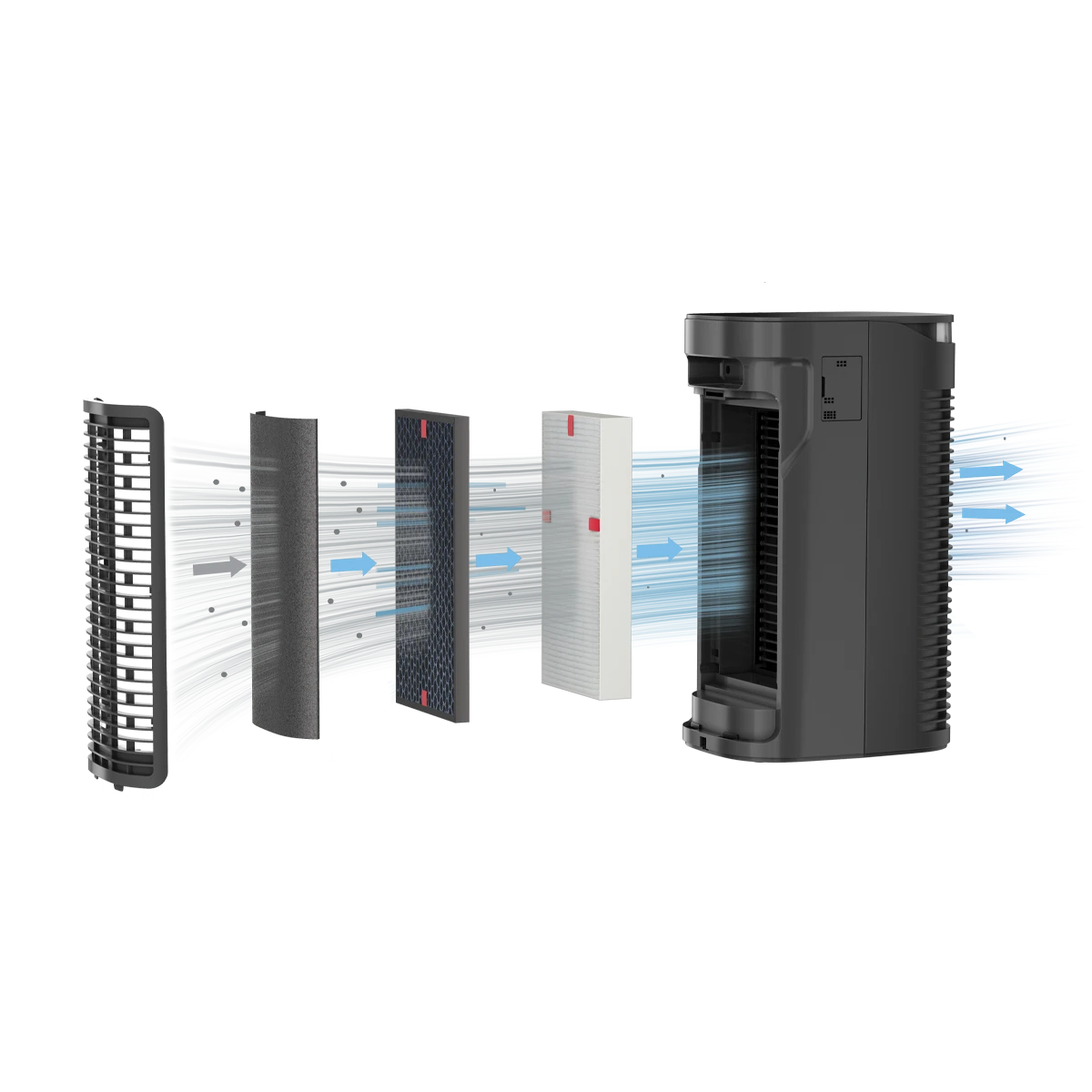 - A carbon pre-filter captures larger airborne particles like dust, lint, fibers, smoke, VOCs, and odors from cooking, pets, and bathrooms
