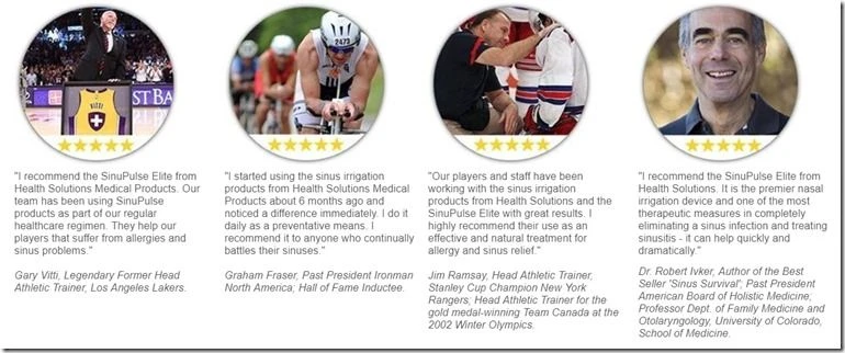 - The system comes complete with the SinuPulse Elite irrigator, four (4) tips, including two (2) sinus irrigator tips (one atomizer mist spray /one cleansing irrigation), and two (2) throat tips (one atomizer mist spray /one cleansing irrigation). Also included are 30 packets of SinuAir® specially formulated saline powder, plus health tips from nationally recognized physician and best selling author of Sinus Survival, Dr. Rob Ivker.