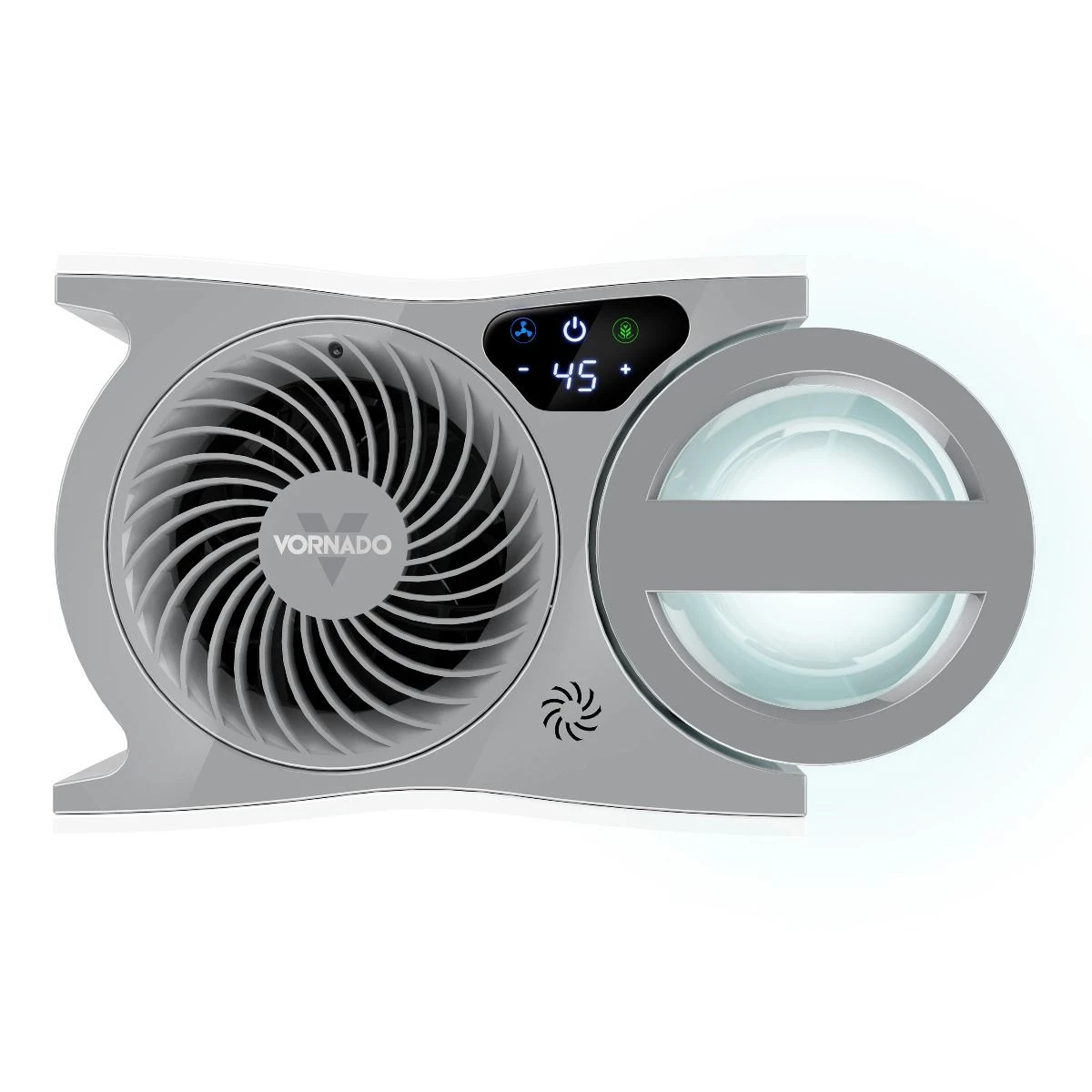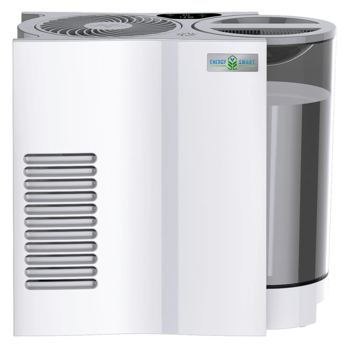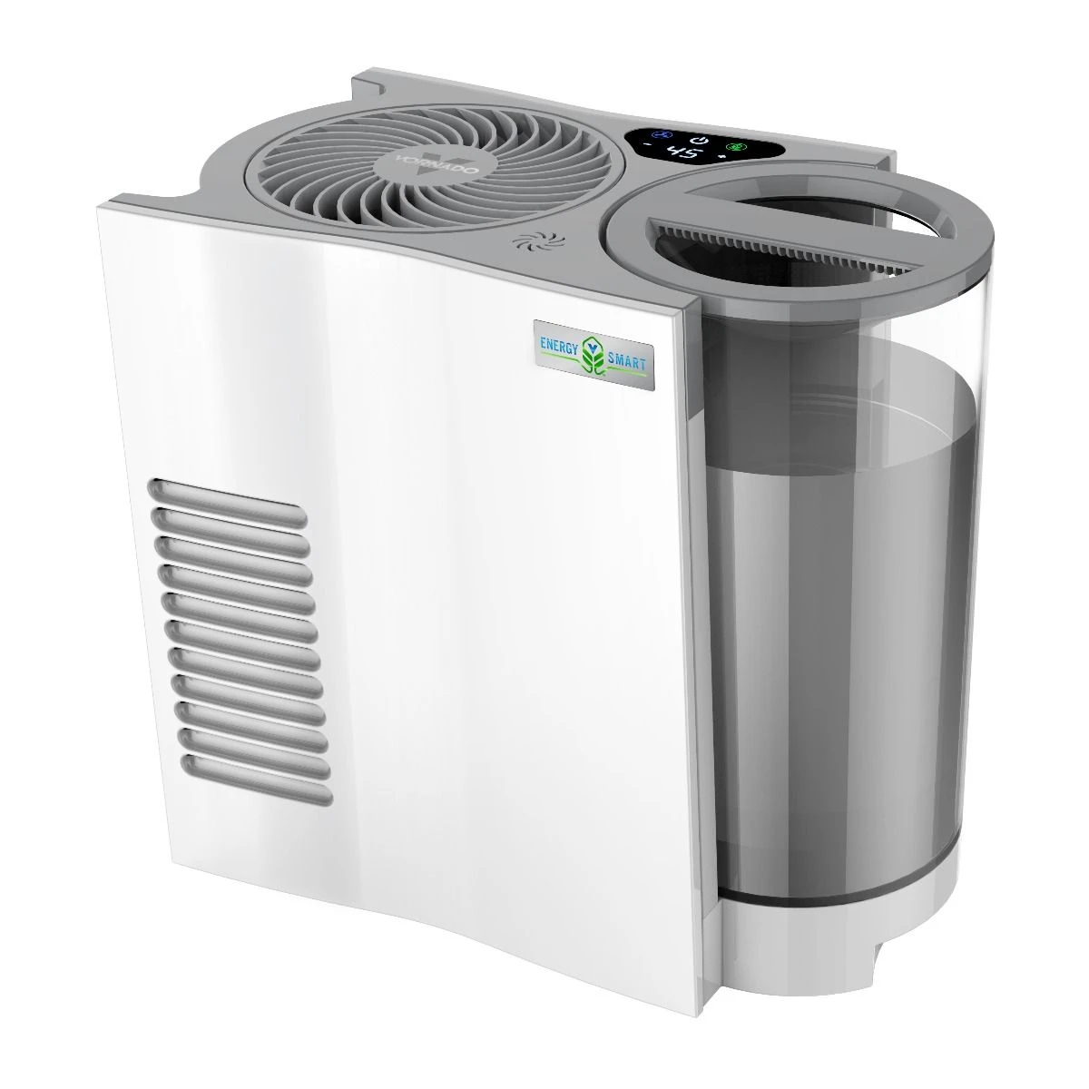 Intelligent touch-sensitive controls located on the unit’s top within the intuitive digital display let you navigate EVDC300 with ease. The fan button lets you select between low, high, and turbo fan speeds while the power button turns the humidifier on or off. The built-in humidistat enables EVDC300 to monitor humidity levels for optimal performance and automatic humidity control. The Energy Smart™ button activates energy-smart mode, which emits the perfect moisture amount using the least amount of power possible. Adjustable humidity levels between 40% and 60% can be customized with the humidity button. Also, with the humidity button, continuous operation can be engaged. The Vornado® EVDC300 Energy Smart Humidifier comes with a 5-Year Customer Satisfaction Warranty and an impressive 10-Year Limited Manufacturer’s Warranty.